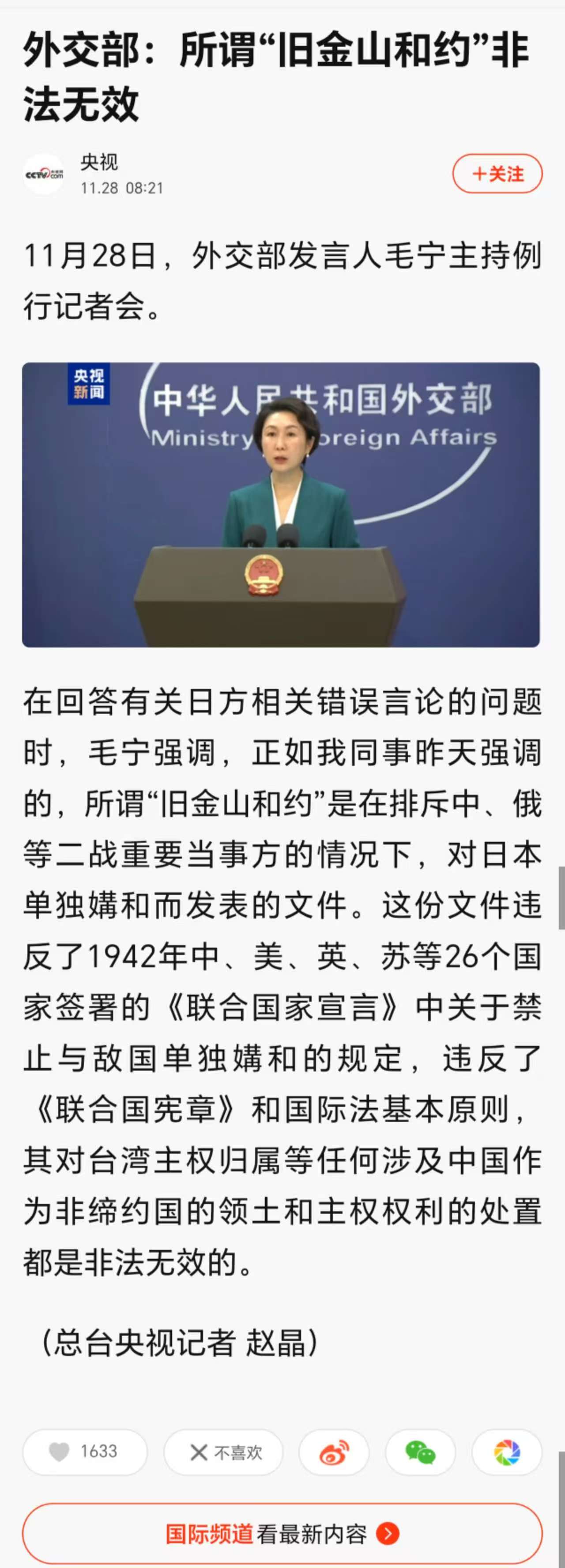 蓦然回首: 不算。老调重弹了好多次了,以前没互联网罢了。从有旧金山合约开始PRC一直是这个讲法,从未改变,联合国有记录备案的,法理上占得住的。PRC当时忙着在朝鲜半岛揍 ...