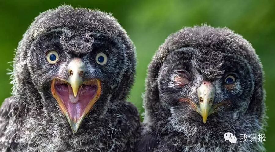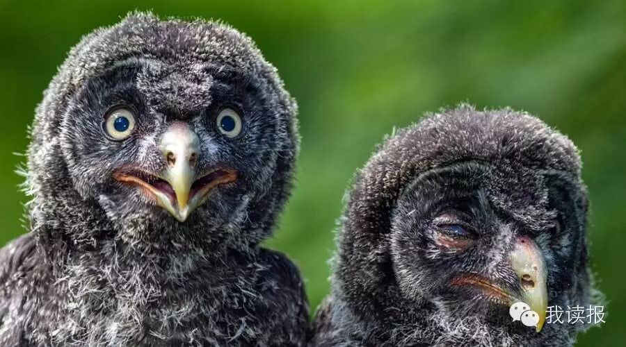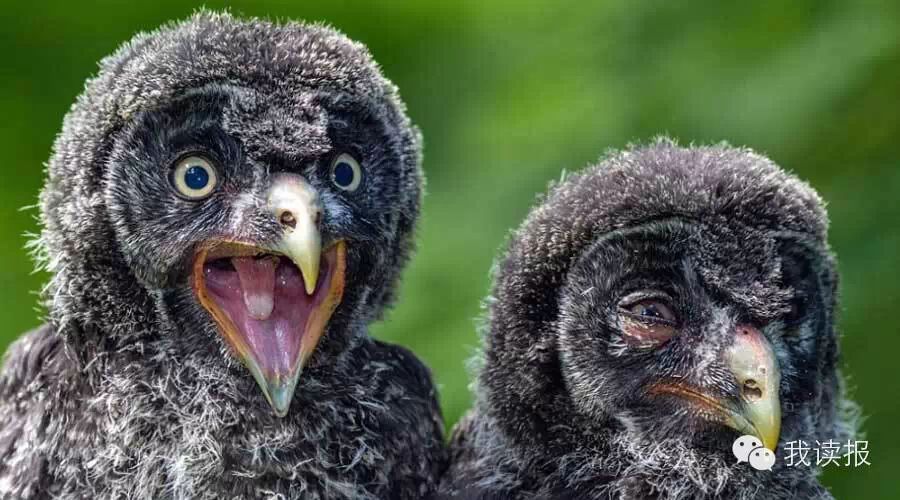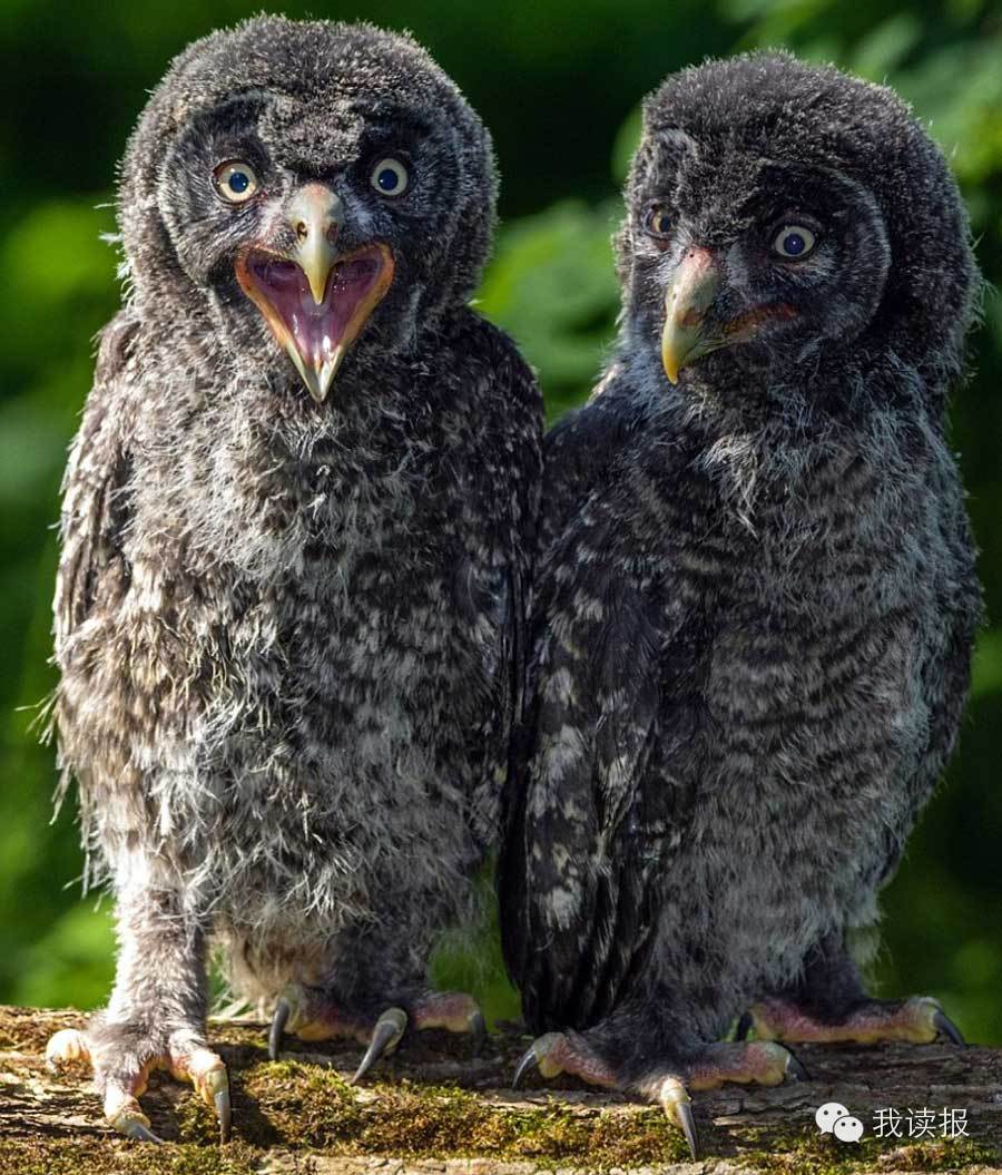 俄罗斯摄影师谢尔盖-伊万诺夫拍摄的照片,展现了一对小灰枭兄弟的搞笑瞬间:我要唱歌啦,你干嘛挤眼?!