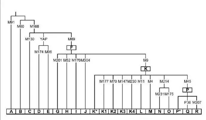 带突变标志的人类Y染色体单倍群分类图,注意F、K、P本身也是一类