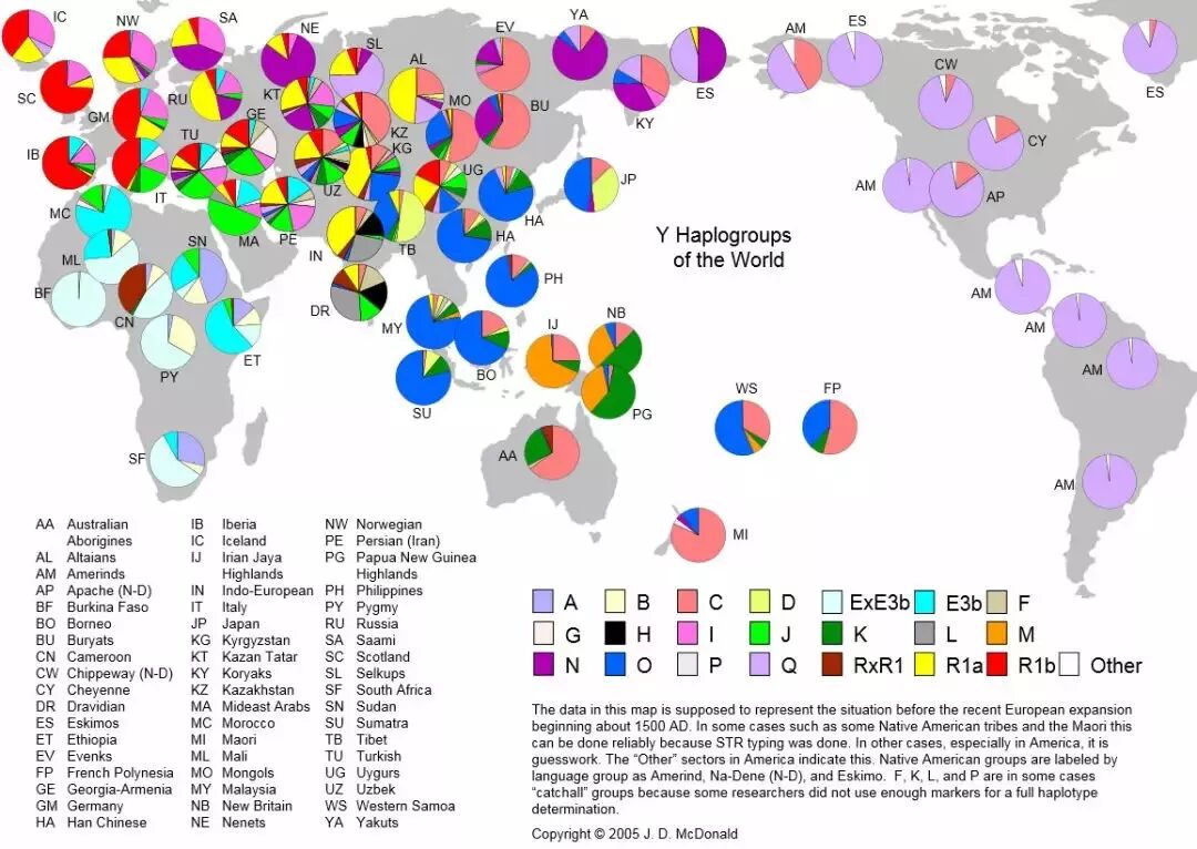 所以,这个O类的汉人男子,他的祖上依次是Y染色体“亚当”(现代人共祖)、M168突变男(C-R共祖)、M89突变男(F-R共祖)、M9突变男(K-R类共祖)、M214突变男(N和O共祖)、M175突变男(O类共祖)。有96%的汉人男子是M9突变男的子孙;也有不到1%的汉人男子是D类的,是M174突变男的后代,他也是不少日本人的先祖;另外的汉人男子主要是C类的,是M130突变男的后代。