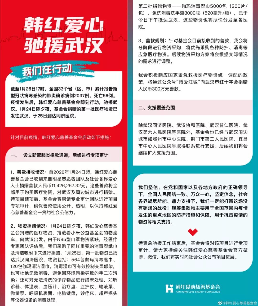 早在除夕夜那晚,「韩红爱心慈善基金会」就已经将医疗物资运往了武汉: