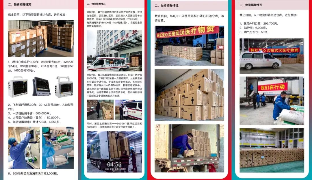 接下来每一天,「韩红爱心慈善基金会」都会公布项目的实时进展,包括善款接收和物资捐赠情况: