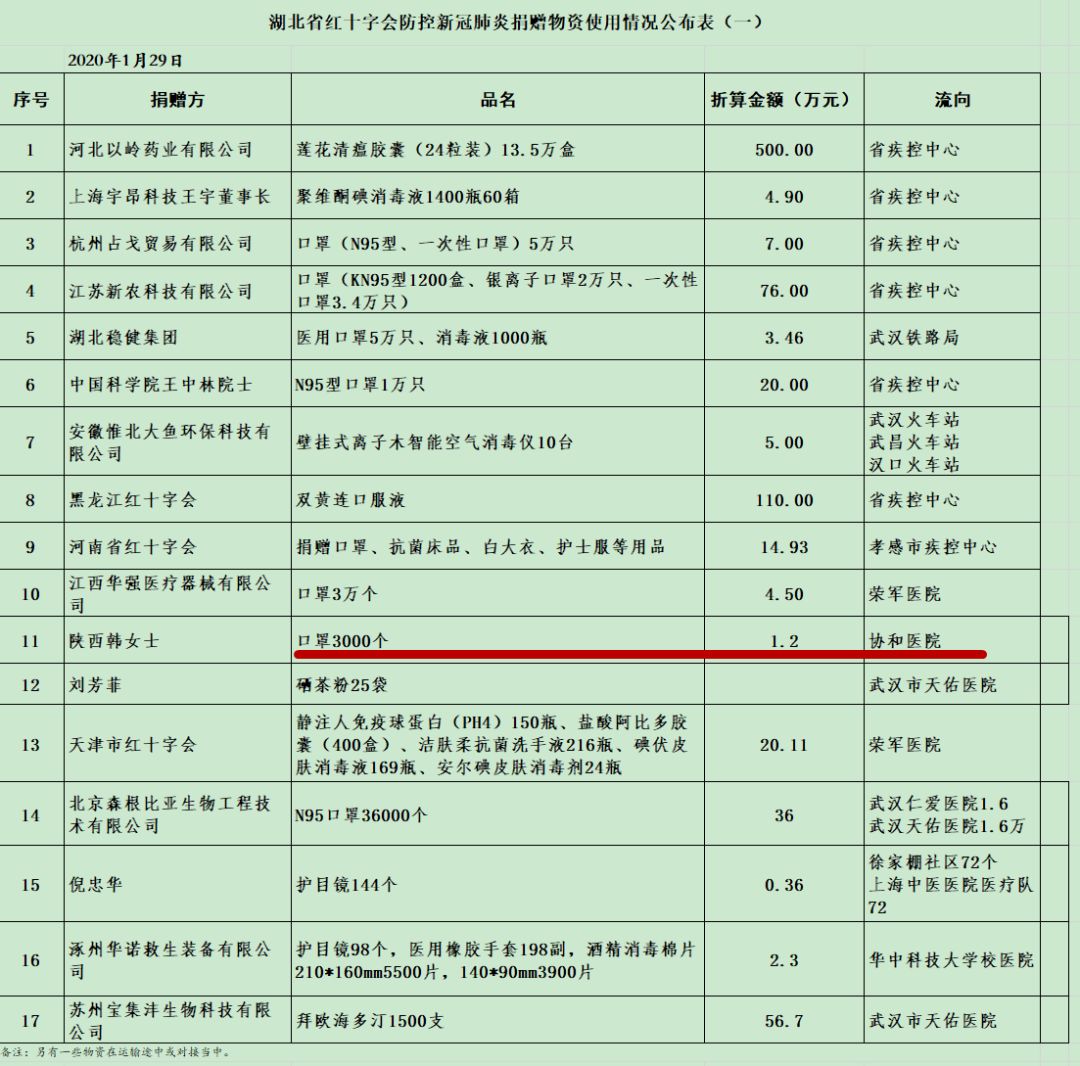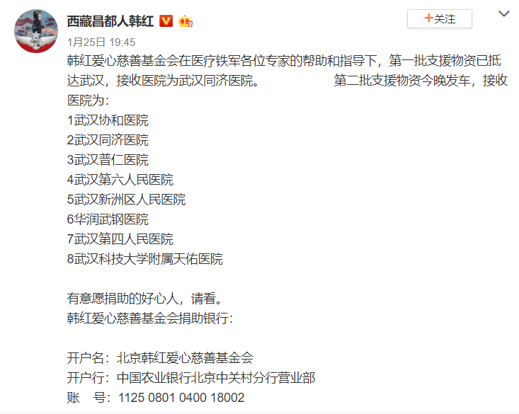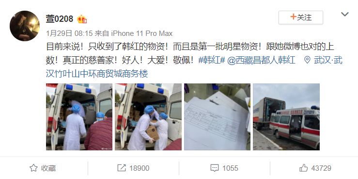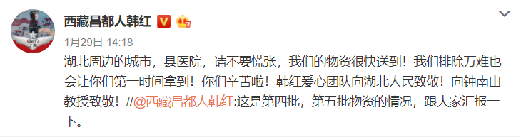 所以一直到1月29日,才有人收到第一批捐款物资,而且不是官方调拨,而是韩红的物资: