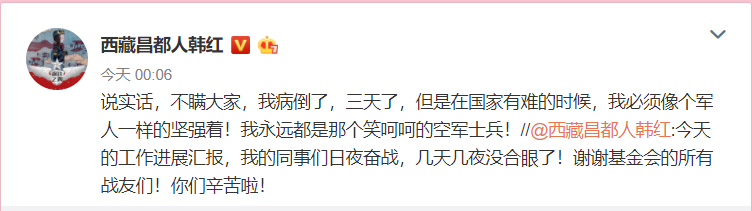 是的,尽管韩红的基金会,筹款总额至今,只有微不足道的3000万元,但第七批物资已经在途中了。