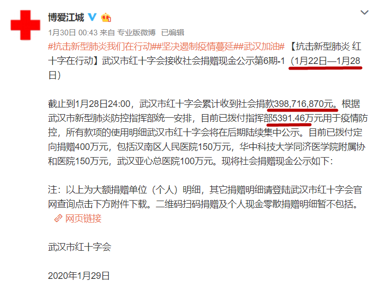 从1月22日-1月28日,累计收到捐款3.9亿元,然后一直到1月30日,才拨付了5000万元给疫情防控: