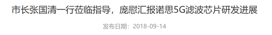 2018年9月14日,天津市市长张国清一行到诺思调研,庞慰董事长汇报诺思5G FBAR射频滤波器目前产业化进程的情况,承诺将在2018年底向市场提供5G频段 FBAR滤波芯片样品。