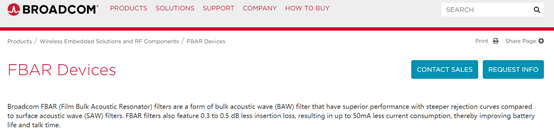这里的FBAR滤波器可以简单理解为BAW滤波器的一种,其他的BAW滤波器还有SMR滤波器,下面是博通官网对FBAR的解释: