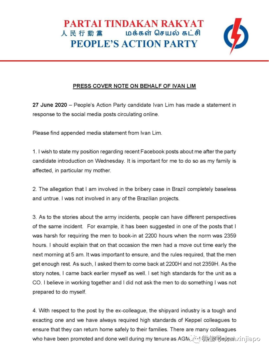 6月27日中午,人民行动党发表文告,传达林绍权对此事的声明。