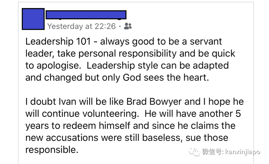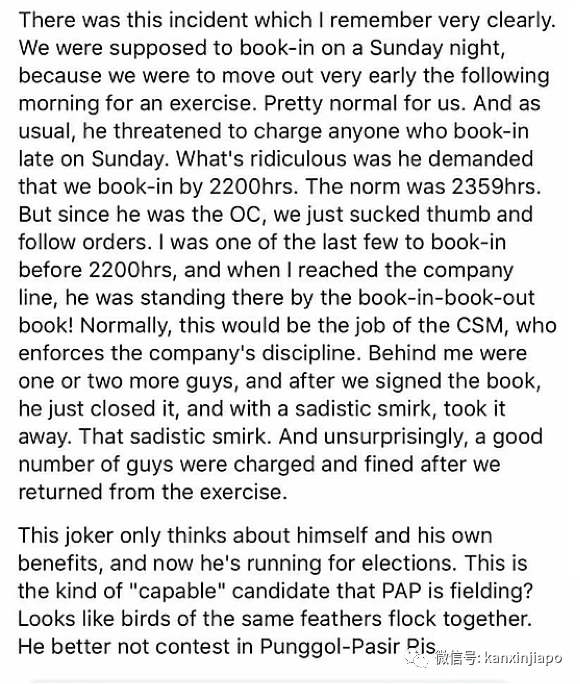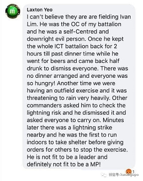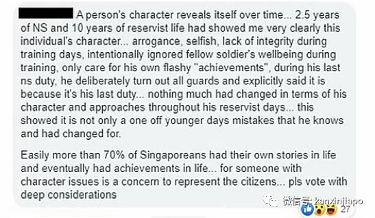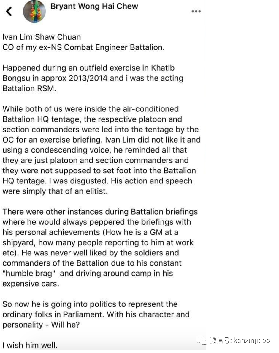 还有个网民说:“两年半的全职国民服役和10年的战备役让我看清楚了他——傲慢、自私、缺乏诚信、有意忽视官兵利益,只关心自己的‘亮眼成就’。在林绍权上一次回营训练,他故意下令警卫班紧急集合,然后告诉他们,‘这是我的最后任务’。”