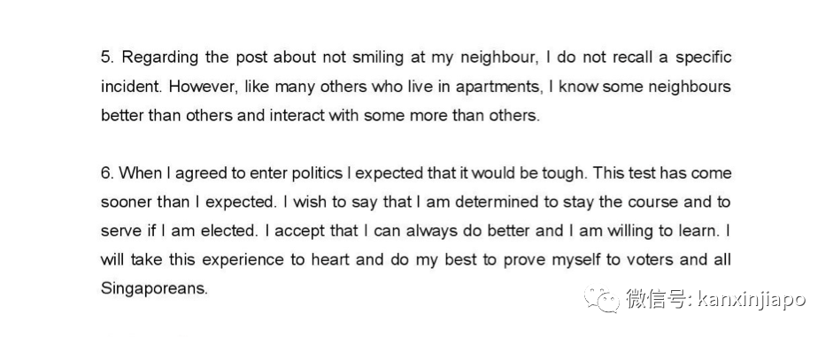 6. 当我同意从政时,我知道前路不易。这场考验来得比预想早。我会继续参选,如果我当选,我会为人民服务。我能作出改进,我愿意学习。我将认真对待此事,尽力向我的选民和新加坡人证明我自己。