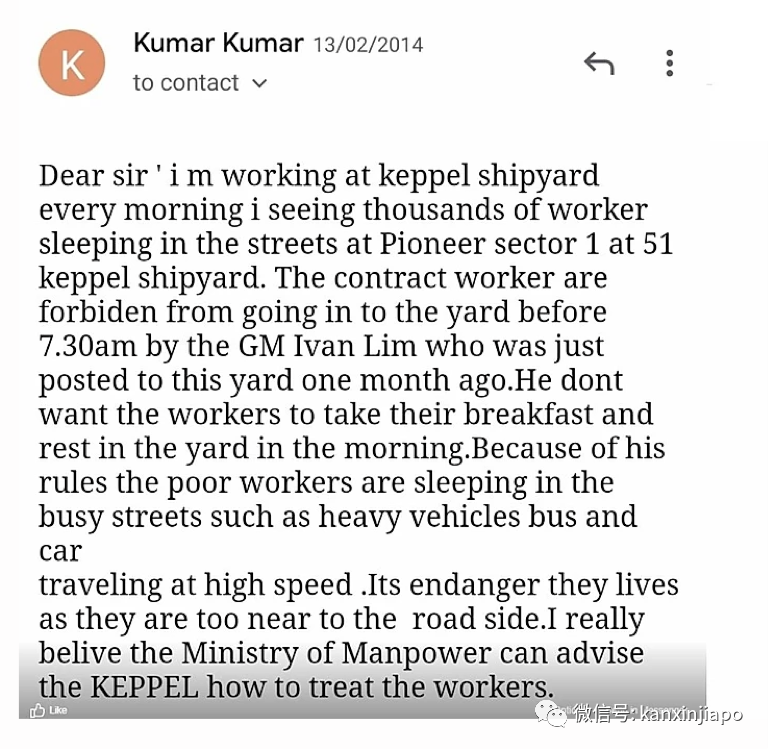 投诉人说:“每天早上我见到好几千个工人在吉宝船厂外的马路上睡觉。一个月前上任的总经理林绍权不许工人们在0730时之前进入船厂用早餐和休息。因为他的这条新规定,这些可怜的工人只好在重型车辆往来的马路边上休息,十分危险。我实在希望人力部能告诉吉宝该如何善待工人。”
