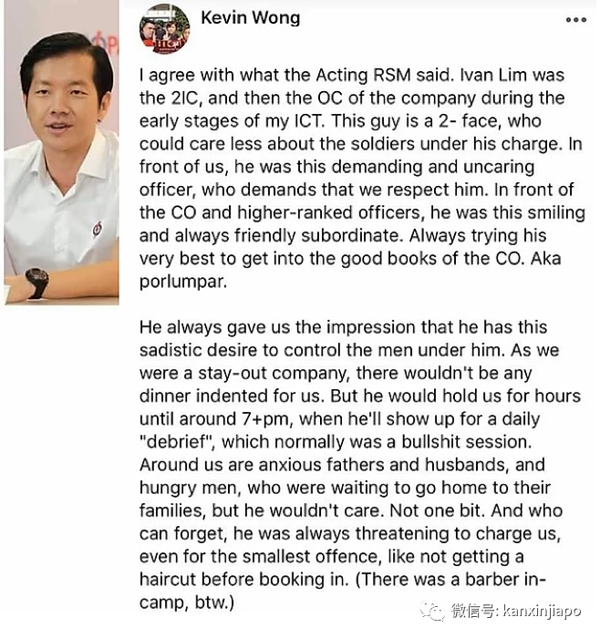 这位网民叫Kevin Wong。他说:“我同意代理军士长说的。在升任营长之前,林绍权曾经是我的副连长,后来升为连长。他是个双面人,对下属士兵毫不关心,十分苛刻,而且要求我们尊重他,对营长和其他上级则笑脸相迎,而且服服帖帖,总要取得营长的好感,也就是俗话说的‘捧卵泡’(马屁精)。”